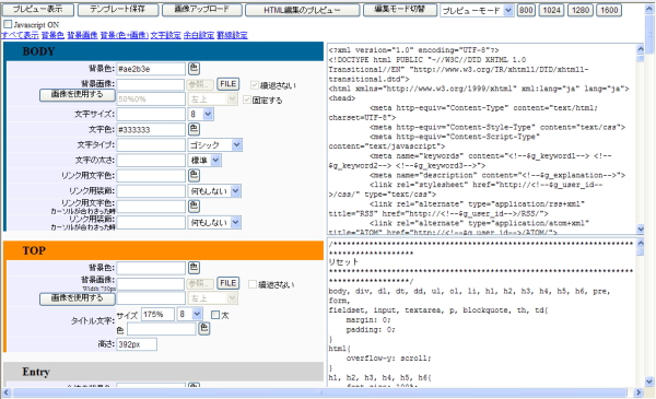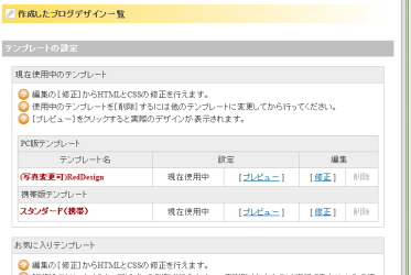 ① ブログ管理ページ上部にある「テンプレート設定/編集 」をクリックし、「お気に入りテンプレート」及び「PC版テンプレート」にある「(写真変更可)RedDesign」の編集欄の [修正] をクリックします。